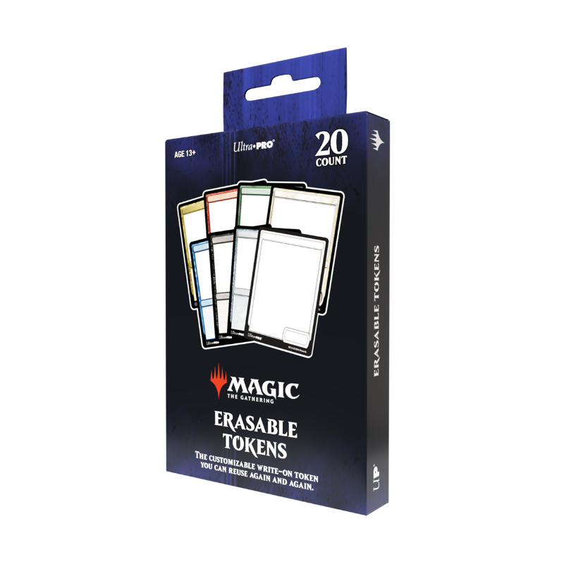 20 jetons réutilisables (2 jetons blancs, bleus, noirs, rouges, verts, artefacts, multicolores et 6 jetons incolores) et 1 stylo effaçable à sec à encre noire avec gomme.