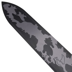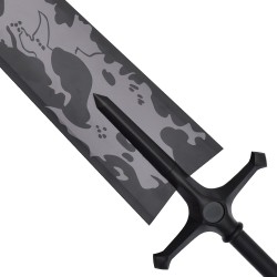La lame large présente une finition sombre avec des motifs stylisés, fidèle à l’esthétique unique de l’épée dans l’œuvre. Sa poignée, sa garde et son pommeau entièrement métalliques apportent solidité et présence à cette pièce de collection.