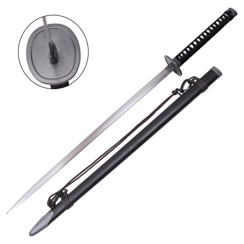 Cette réplique reproduit le design sobre et élégant de l’arme vue dans l’anime. Elle est équipée d’une lame en acier élancée, associée à une tsuba métallique ronde et à une poignée en bois recouverte d’un tressage traditionnel noir et blanc, fidèle au style classique des katanas japonais.