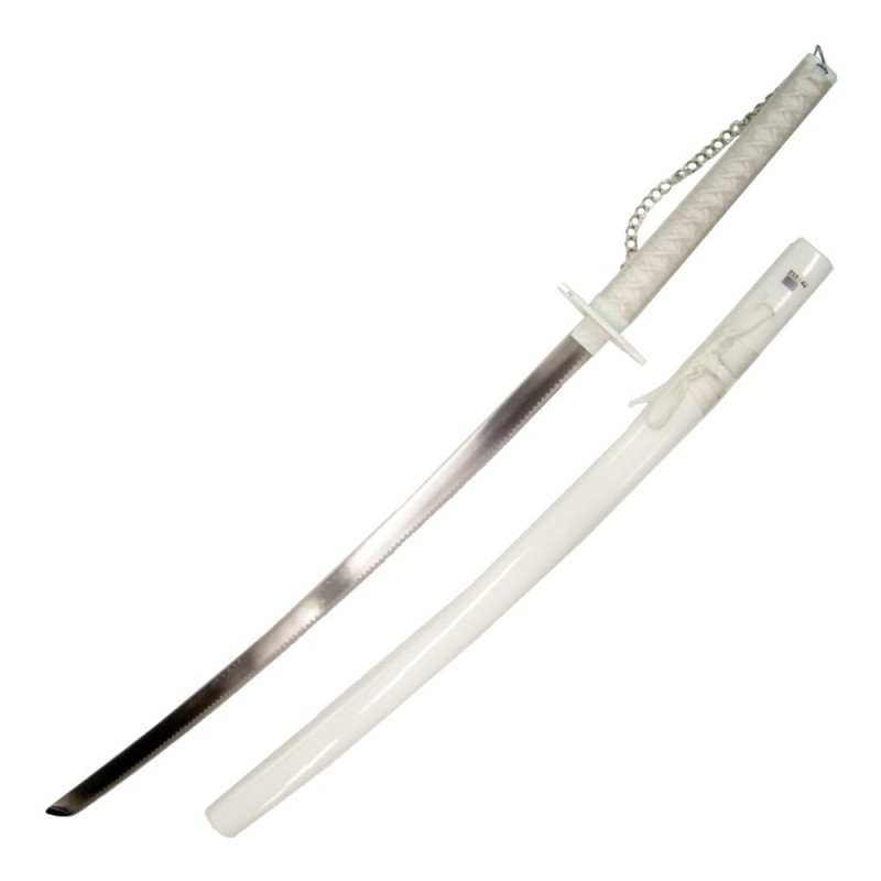 Le katana est accompagné d’un fourreau en bois blanc, assorti à l’ensemble, permettant de protéger la lame et de mettre en valeur cette pièce de collection. Une chaîne décorative fixée à la poignée rappelle également l’apparence distinctive du Zanpakutō dans l’anime.