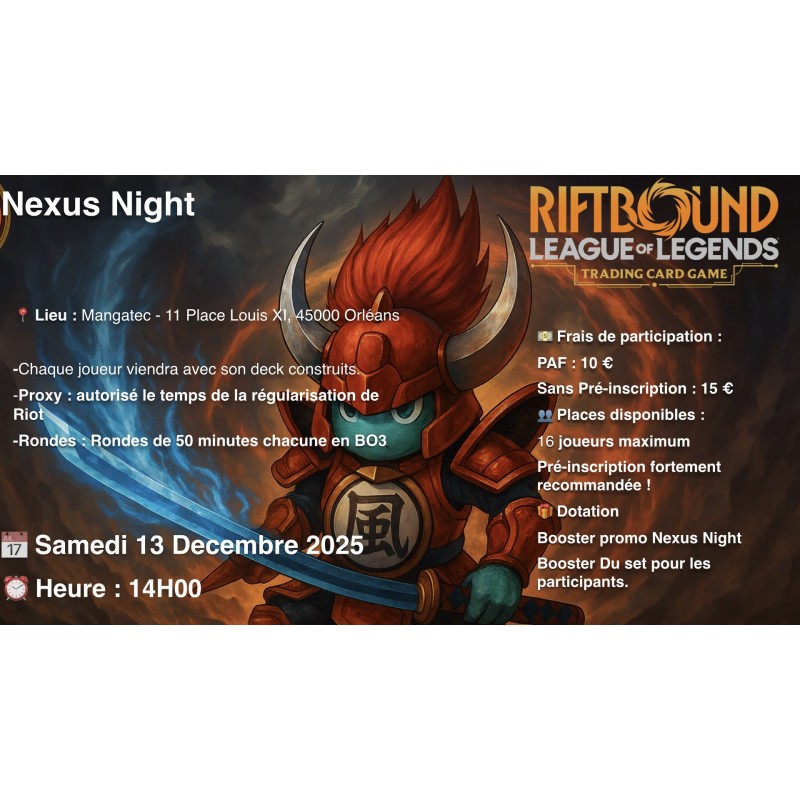 Découvrez le tournoi Leagle de Riftbound, le jeu de cartes officiel League of Legends. Organisé à la boutique Shinjuku-World – La Mangatec à Orléans, cet événement compétitif se joue au format Standard avec banlist en vigueur et rondes en BO3. Limité à 16 participants, il propose des dotations officielles fournies par Riot Games ainsi que des récompenses supplémentaires pour les meilleurs joueurs.