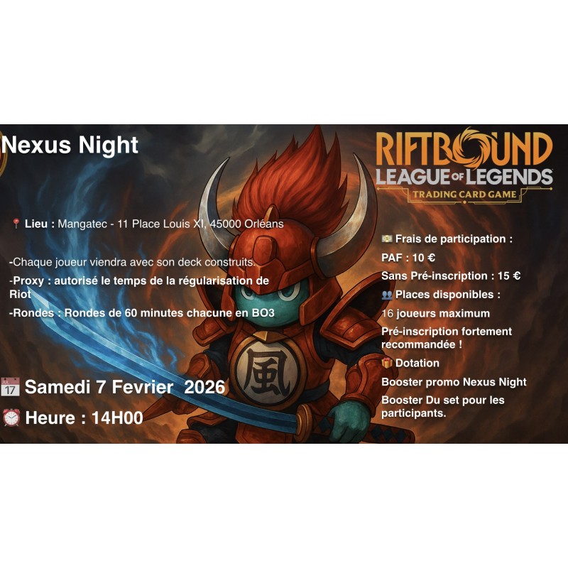 Découvrez le tournoi Leagle de Riftbound, le jeu de cartes officiel League of Legends. Organisé à la boutique Shinjuku-World – La Mangatec à Orléans, cet événement compétitif se joue au format Standard avec banlist en vigueur et rondes en BO3. Limité à 16 participants, il propose des dotations officielles fournies par Riot Games ainsi que des récompenses supplémentaires pour les meilleurs joueurs.